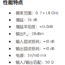 LMA1402是一款驱动放大器,输入/输出端50Ω匹配,频率范围覆盖0.7~1.8GHz。在5V工作电压下,静态电流160mA,提供26dB 的增益,输出 P-1 功率为26dBm,输入/输出回波损耗为-10dB。